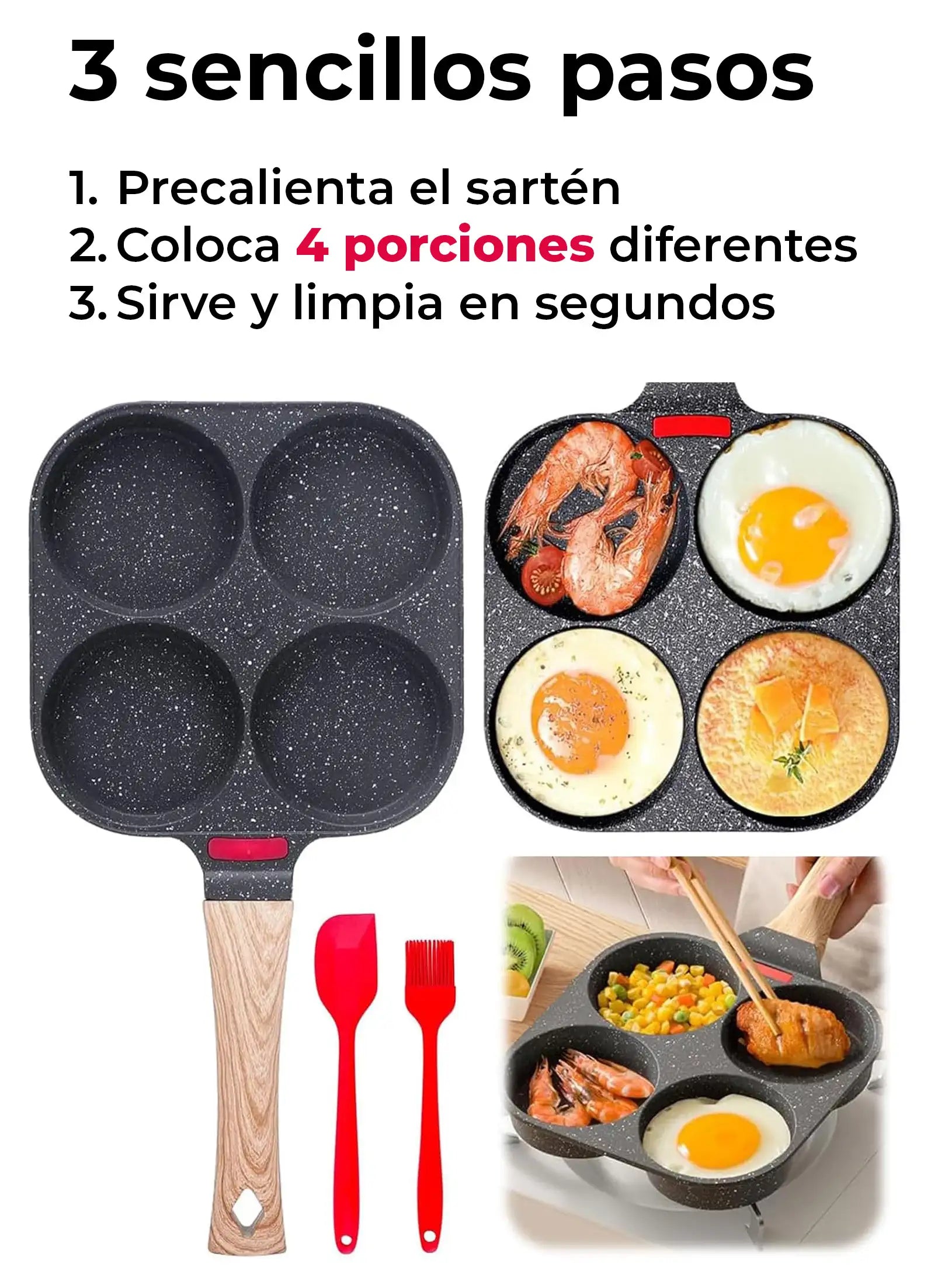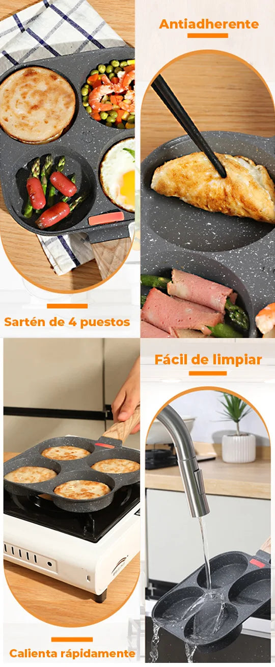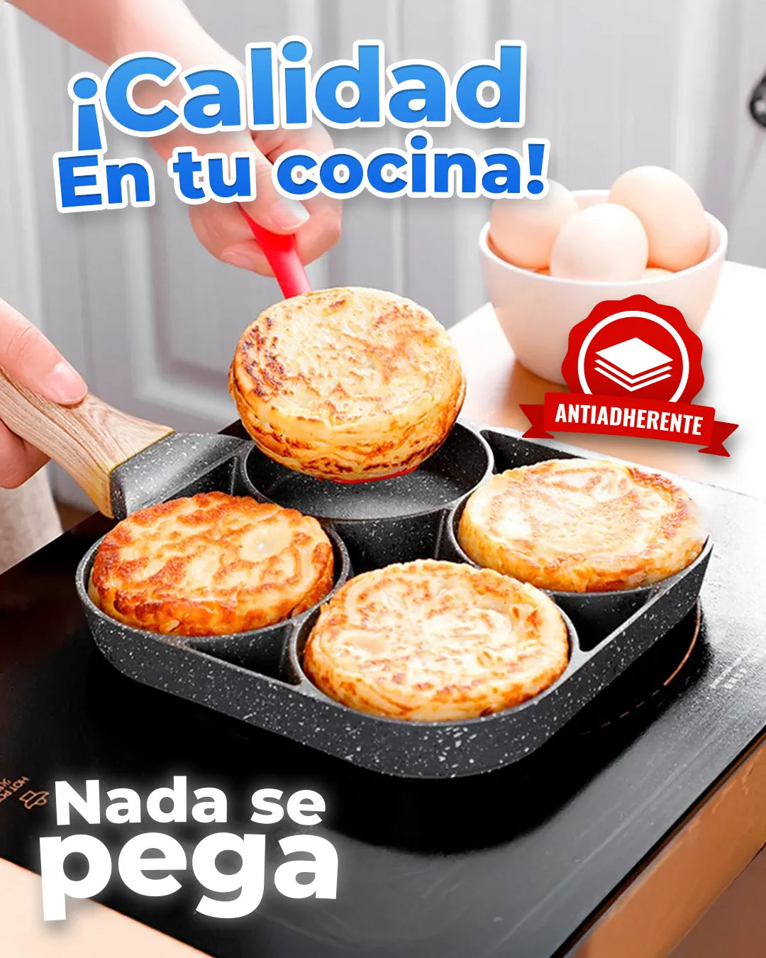 El Sartén Antiadherente 4 Puestos tiene un recubrimiento multicapa que evita que cualquier alimento se adhiera. Todo se desliza fácil, se cocina parejo y la limpieza toma segundos. Sin quemados, sin restos pegados, sin esfuerzo.