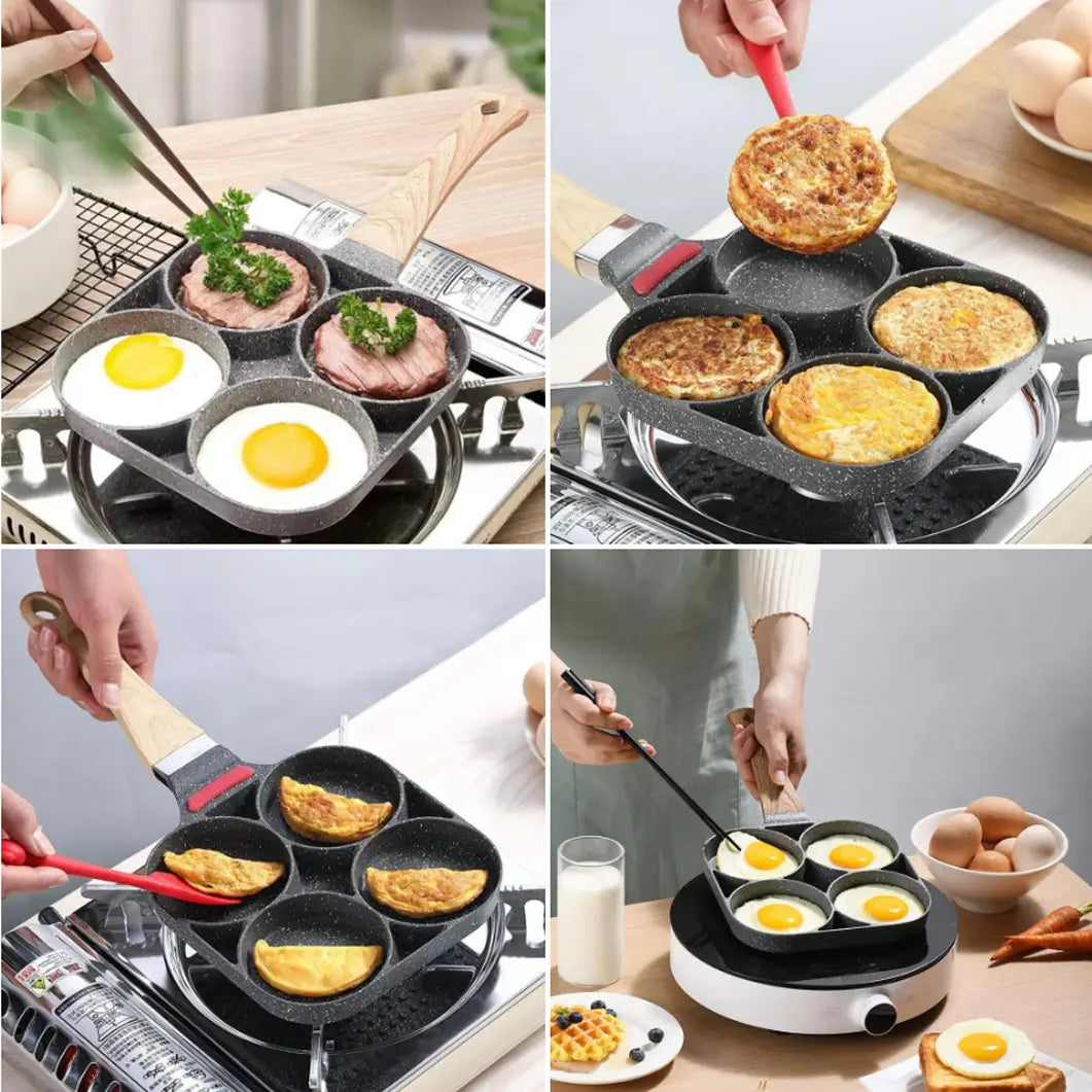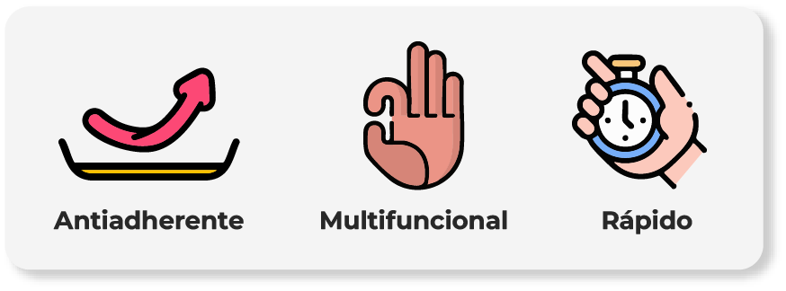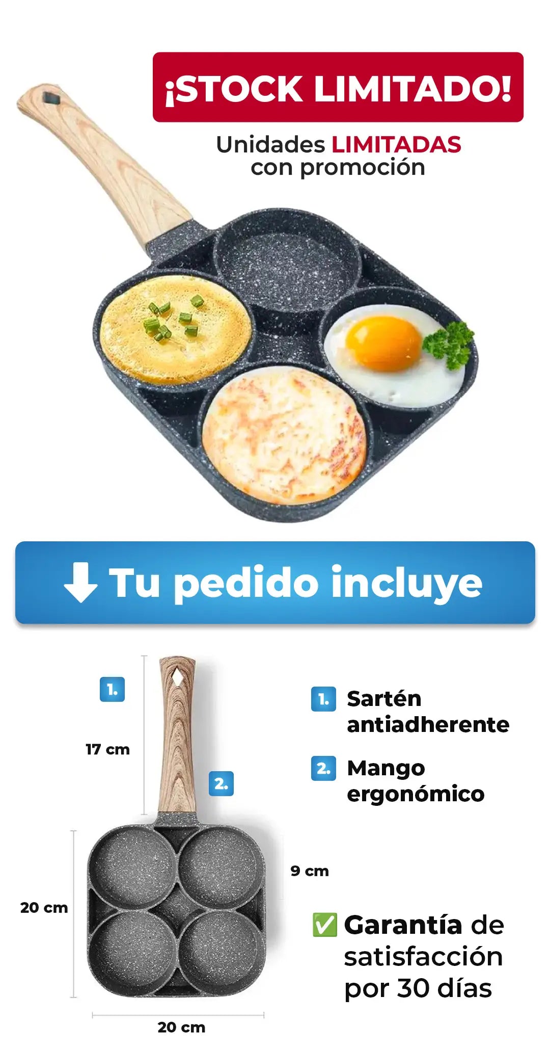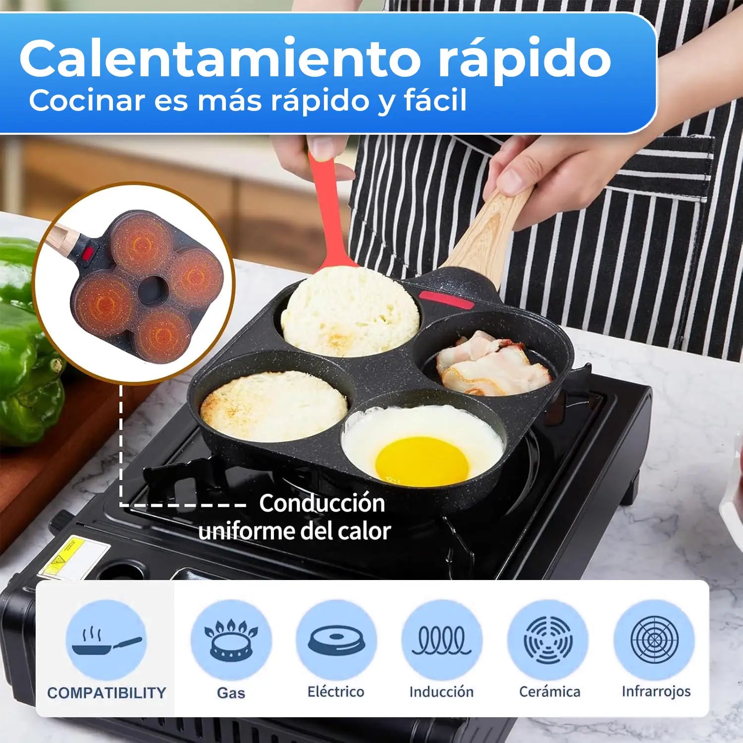 El Sartén Antiadherente 4 Puestos tiene un recubrimiento multicapa que evita que cualquier alimento se adhiera. Todo se desliza fácil, se cocina parejo y la limpieza toma segundos. Sin quemados, sin restos pegados, sin esfuerzo.